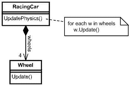 Note that shared aggregation implies that when a RacingCar is destroyed its Mesh is not destroyed. (Also note how the diagram shows that a Mesh object knows nothing about a RacingCar object).